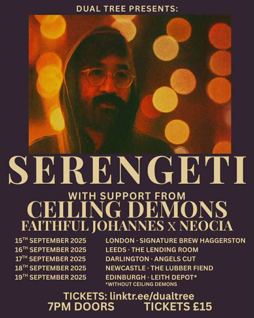 Big news time. Me and Neocia started collaborating over a shared love of Chicago rapper Serengeti. Geti is my most listened to artist every year on the streams. We’re made up, rubbing eyes in disbelief, to be supporting on all five dates – LONDON / LEEDS / DARLINGTON / NEWCASTLE / EDINBURGH – of the upcoming Serengeti UK tour, alongside our friends Ceiling Demons. All the ticket links are on the ‘Live’ page of this website https://faithfuljohannes.com/live/